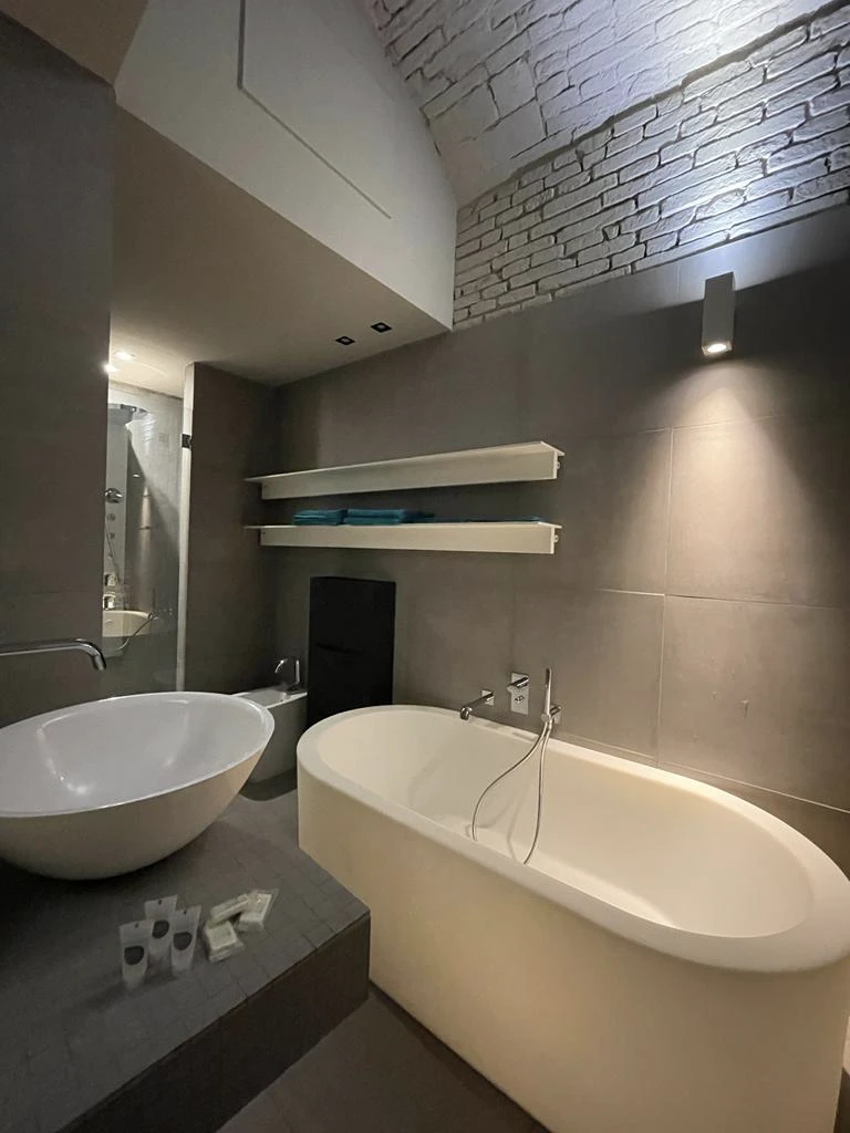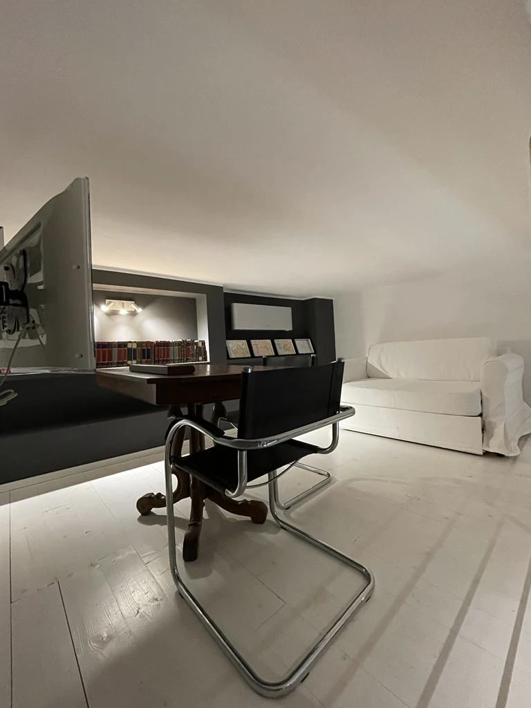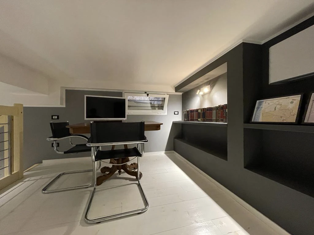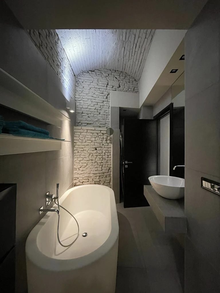Il bagno, particolarmente bello e curato nei minimi dettagli, è dotato di una spaziosa vasca da bagno e di una comoda doccia. L’appartamento dispone inoltre di uno studiolo situato sul soppalco, ideale per chi desidera uno spazio tranquillo e riservato per lavorare o studiare.