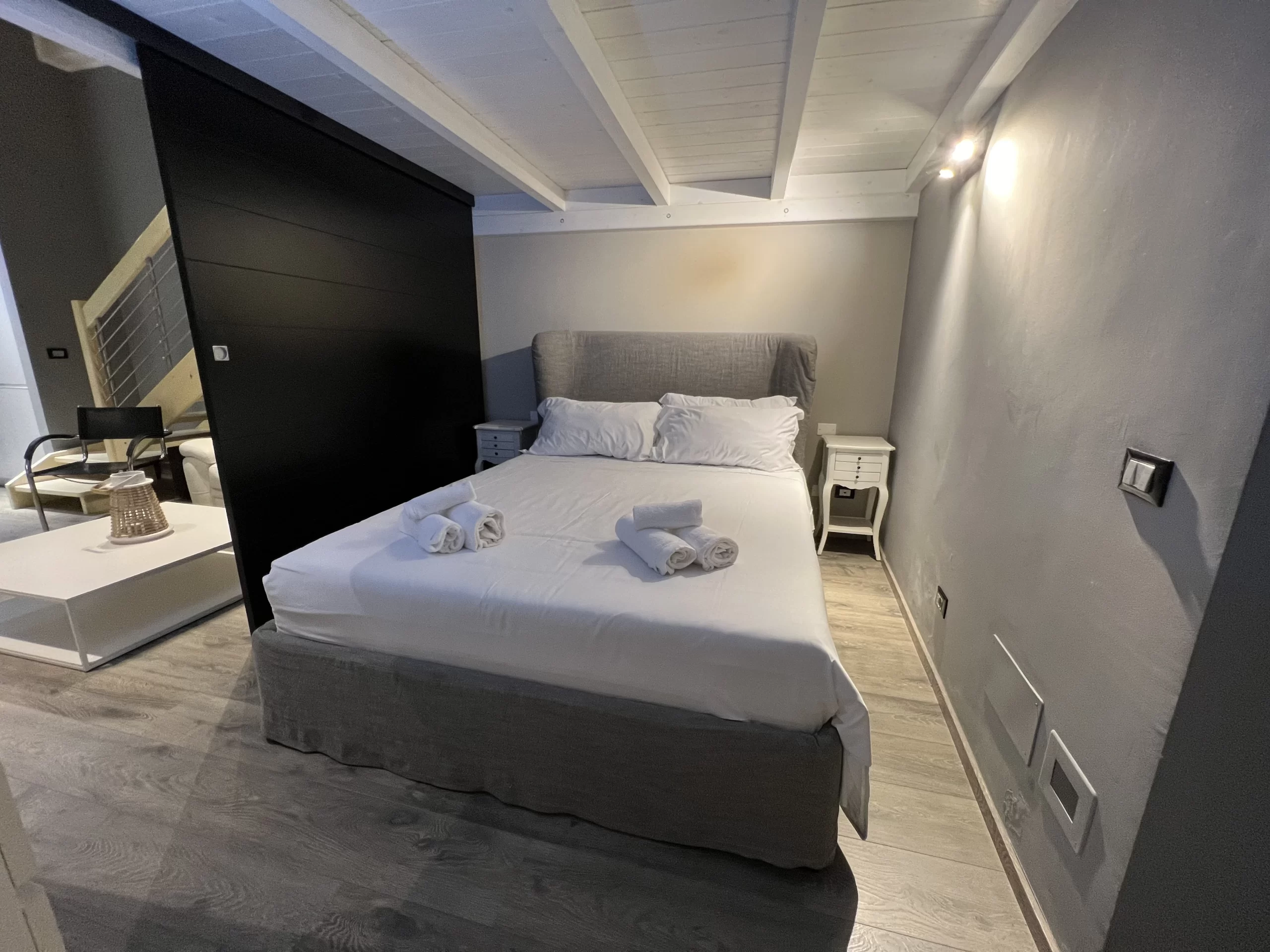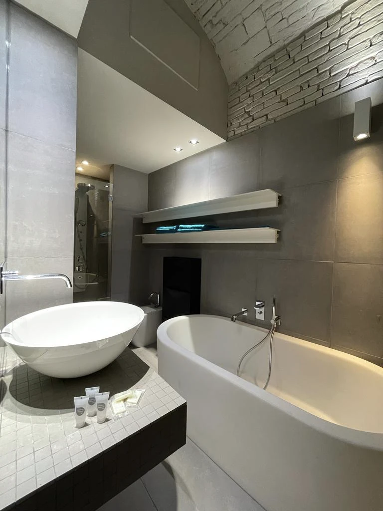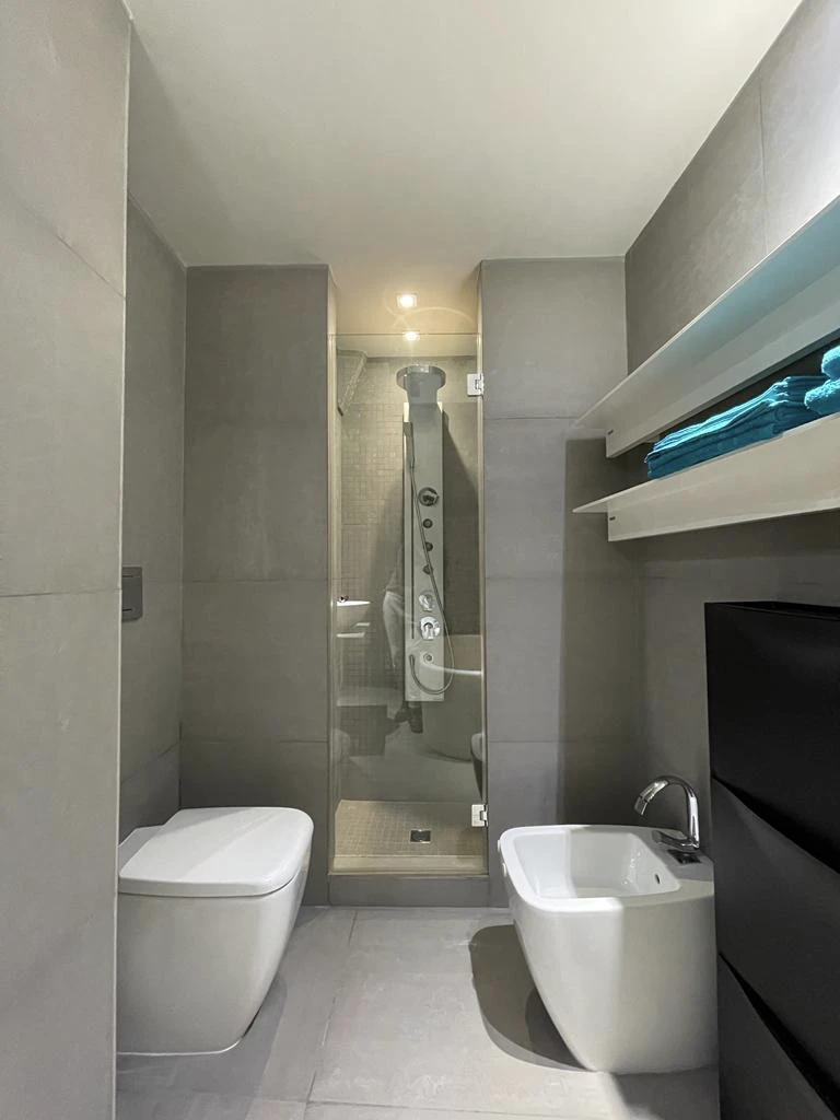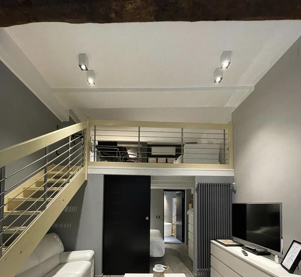 Il bagno, particolarmente bello e curato nei minimi dettagli, è dotato di una spaziosa vasca da bagno e di una comoda doccia. L’appartamento dispone inoltre di uno studiolo situato sul soppalco, ideale per chi desidera uno spazio tranquillo e riservato per lavorare o studiare.